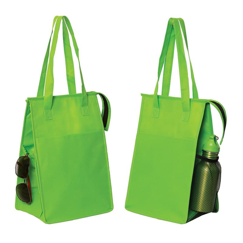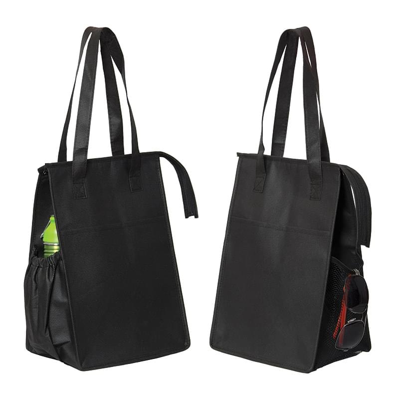 Non woven 90 gram polypropylene|Inner silver liner for insulation|Top zippered closure to main compartment|Two self-material cross-stitched handles|Elastic pocket on one side|Mesh pocket on the other side|Helps keep your cold and frozen foods chilled|Drop in an ice pack (not included) for extra chill|Use for groceries or as a lunch bag